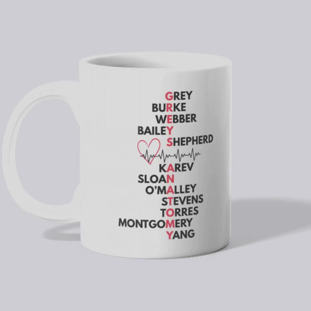 Featuring a vertical list of unforgettable character surnames with a heart-rate line detail, this mug is perfect for fans who know exactly what it means… and love it even more because of that.